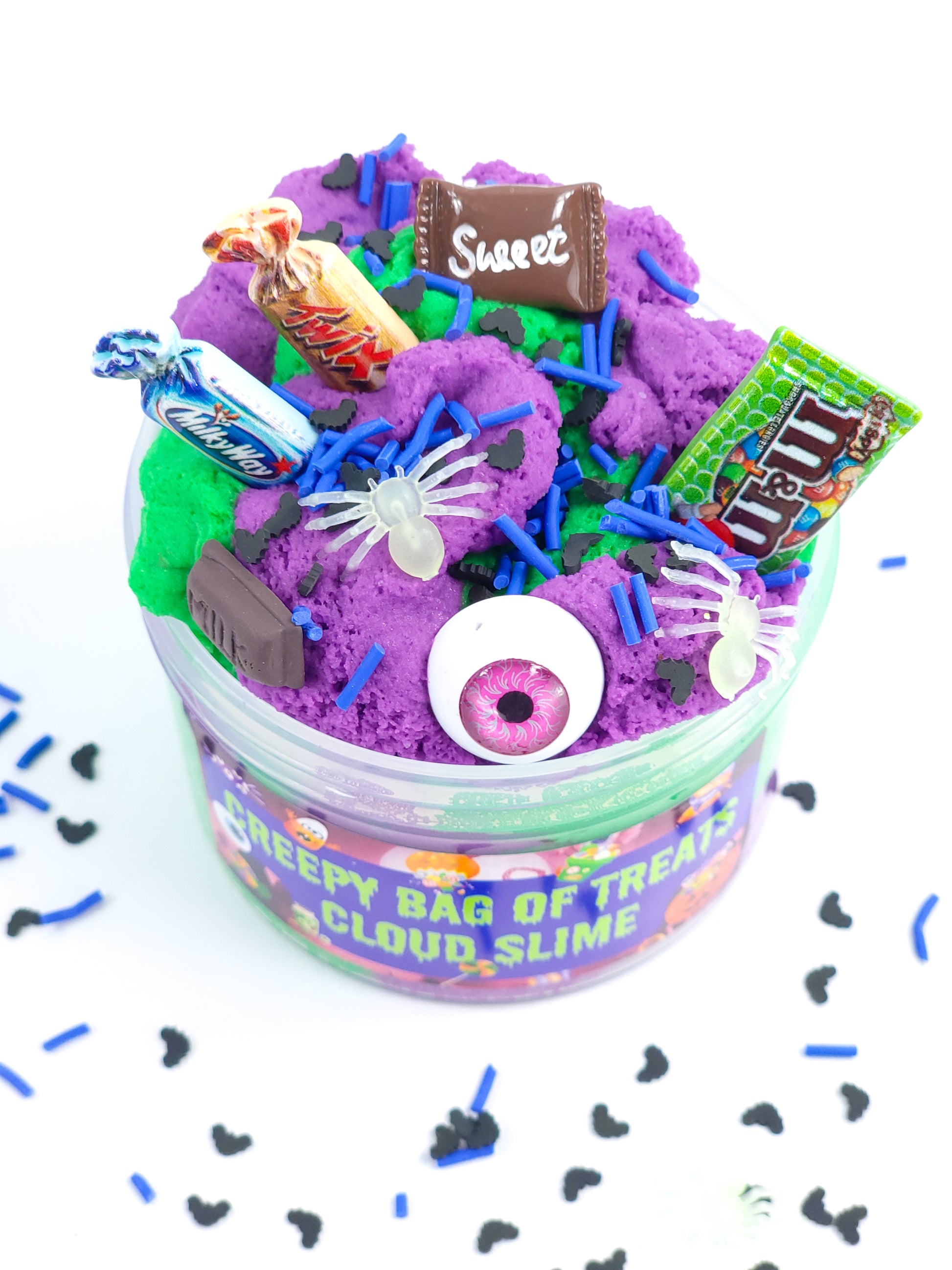 This Halloween cloud cream slime is called Creepy Bag of Treats! It's a candy scented purple and green cloud cream slime filled with spooky treats! It's topped with blue and black polymer sprinkles. This is a fun Halloween slime that has a stretchy dough-like texture.